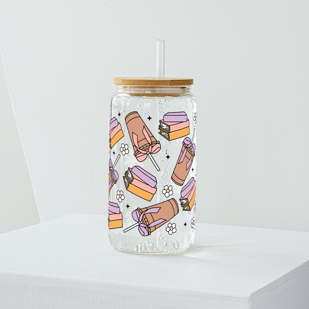 Books with Pink Bows and Flowers Glass Tumbler - Clear 540ml