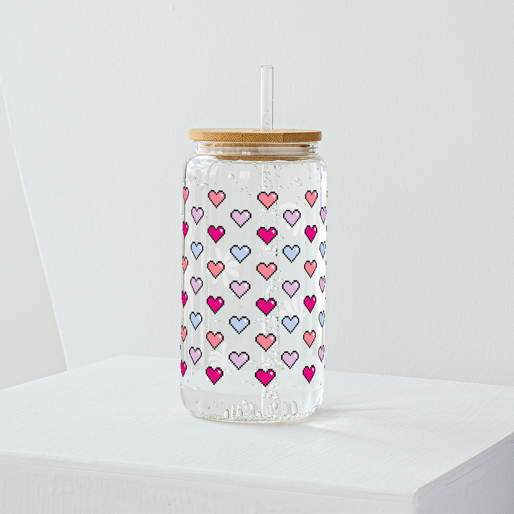 Pink Pixel Hearts Glass Tumbler - Clear 540ml