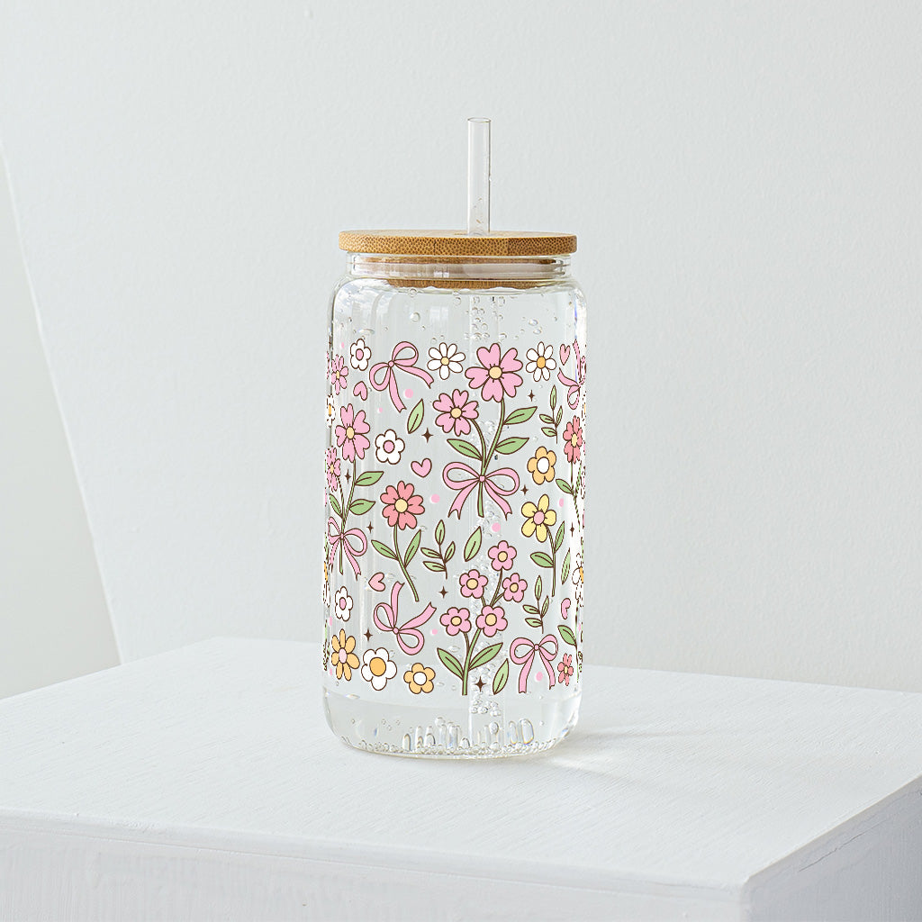 Pink Bow with Flowers Glass Tumbler - Clear 540 ml