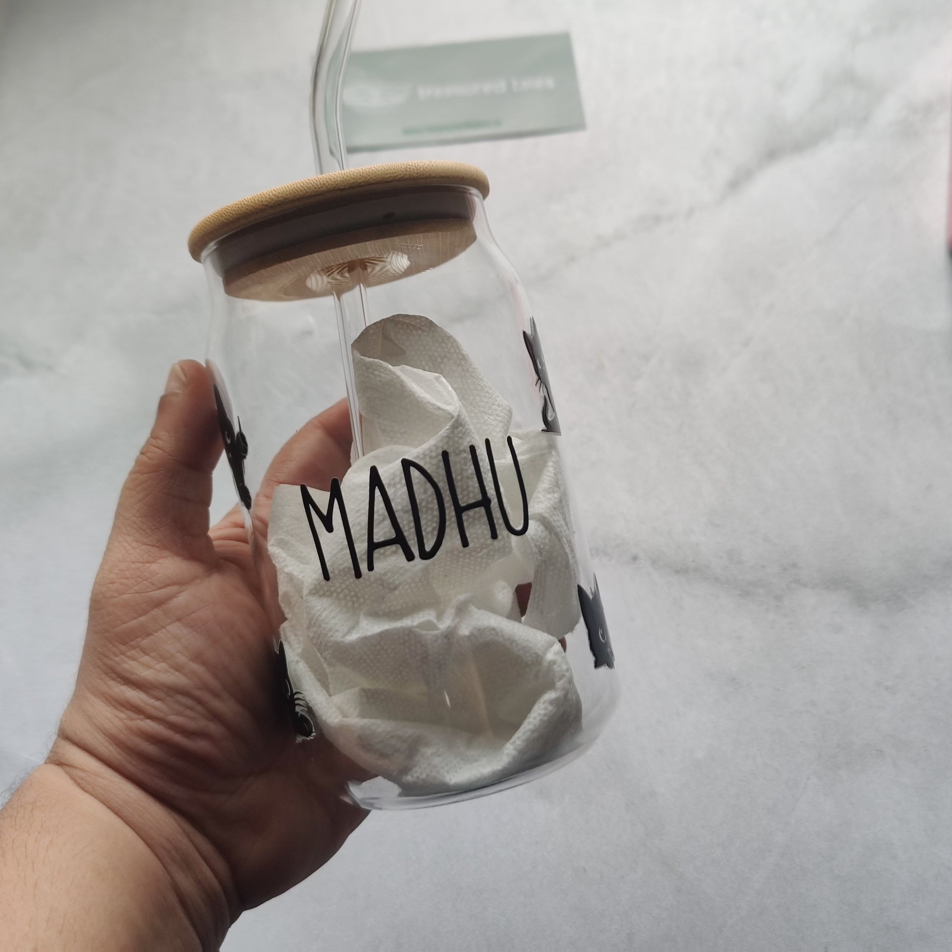 Each glass tumbler features a charming can-shaped design with intricate exterior prints, available in clear finish.