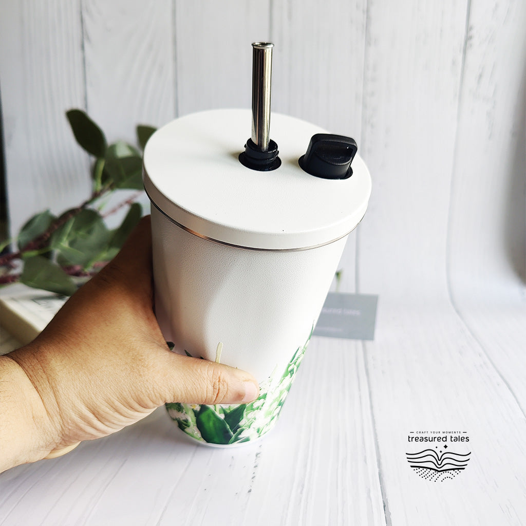 These tumblers are a perfect blend of functionality and flair. With a 600ml capacity, and a reusable metal straw, they are the ultimate travel companions. The double-walled insulation keeps your drinks warm for a couple of hours or cold for up to 6 hours, making them suitable for any kind of beverage.