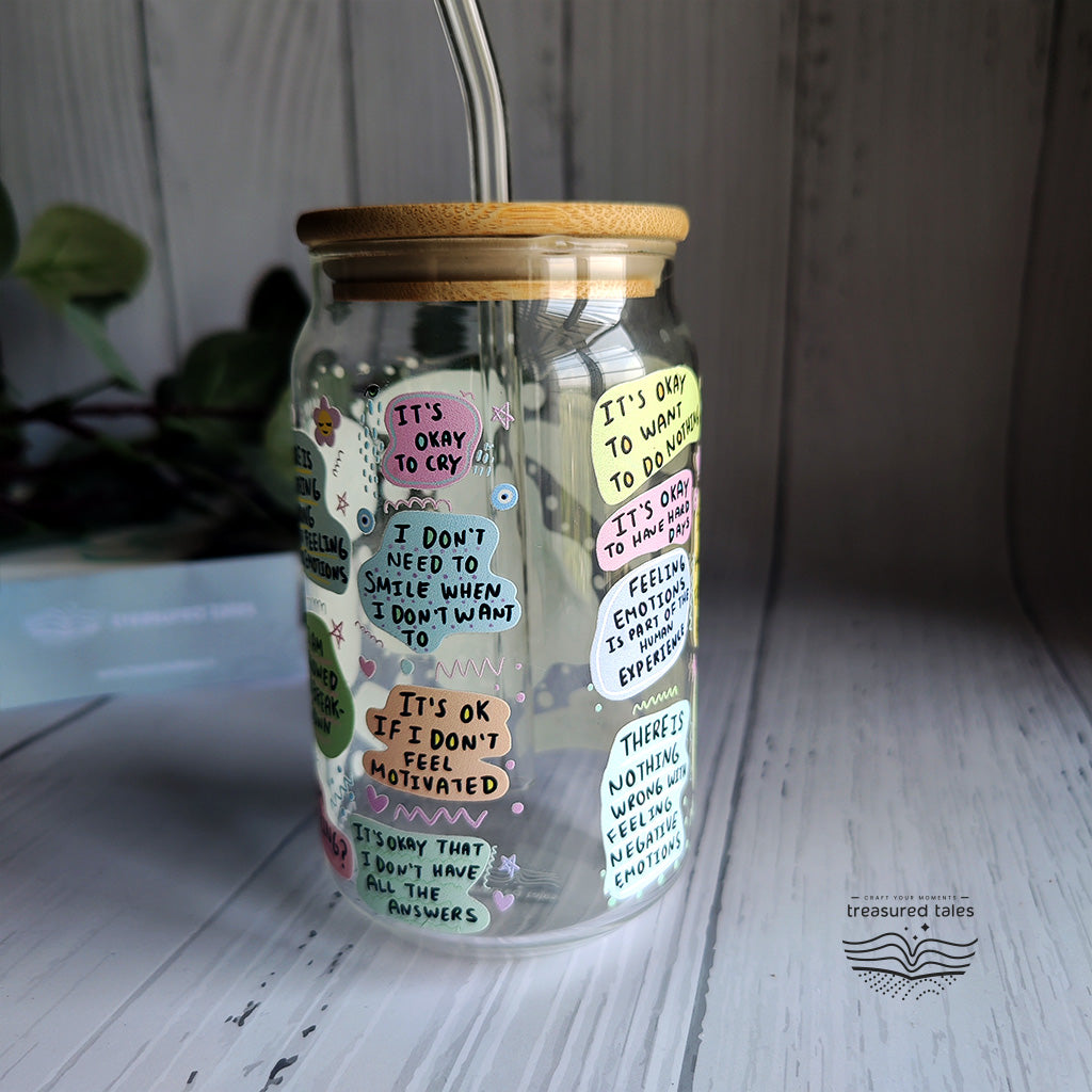 Each glass tumbler features a charming can-shaped design with intricate exterior prints, available in clear finish.