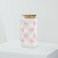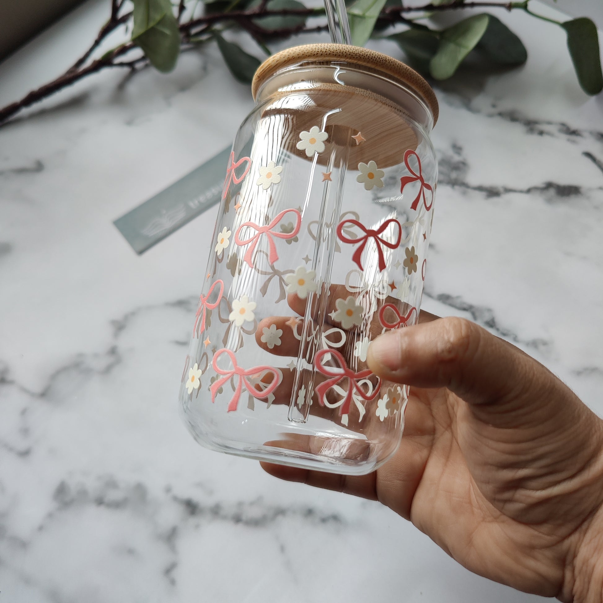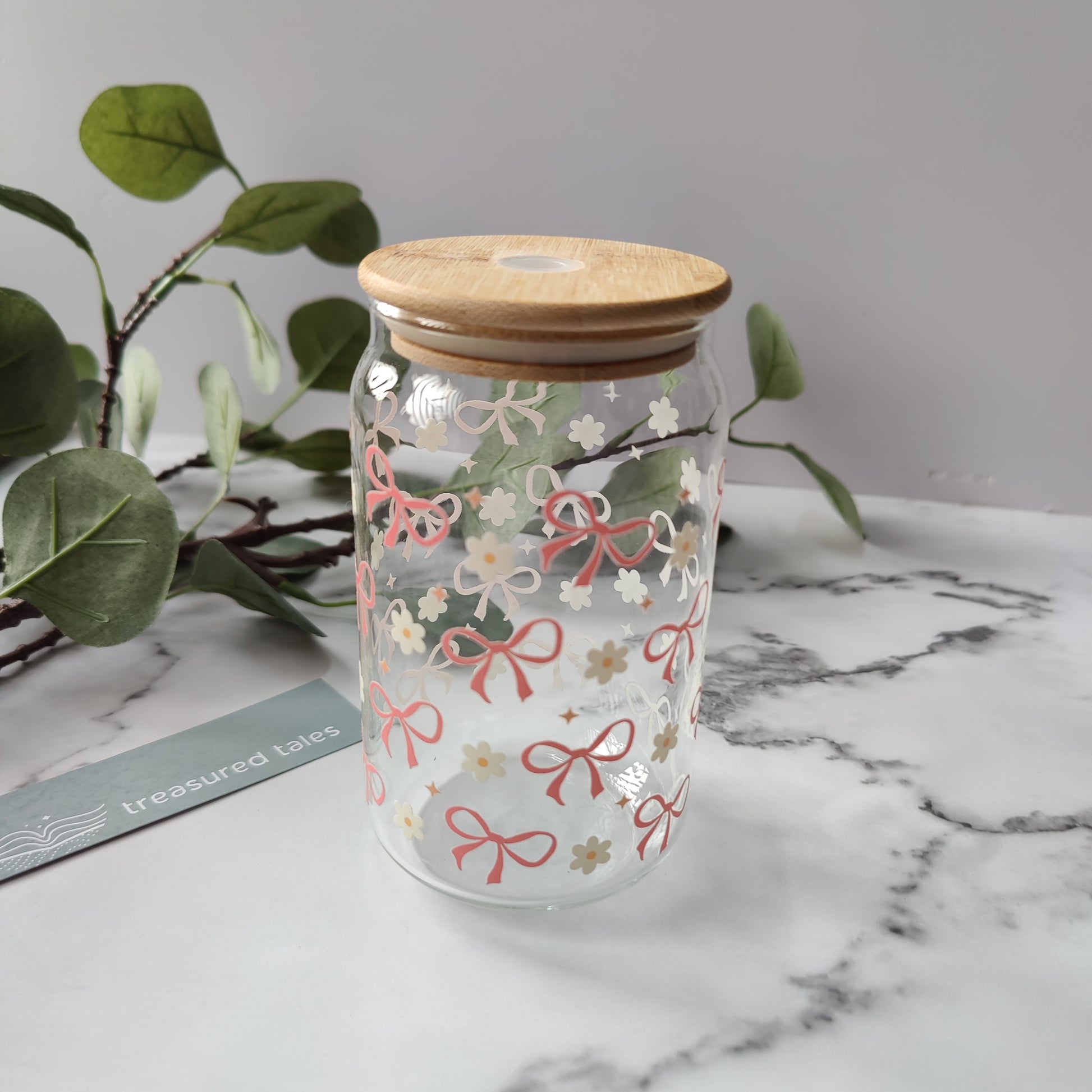 Pink Bow and Daisy Flowers Glass Tumbler - Clear 540ml