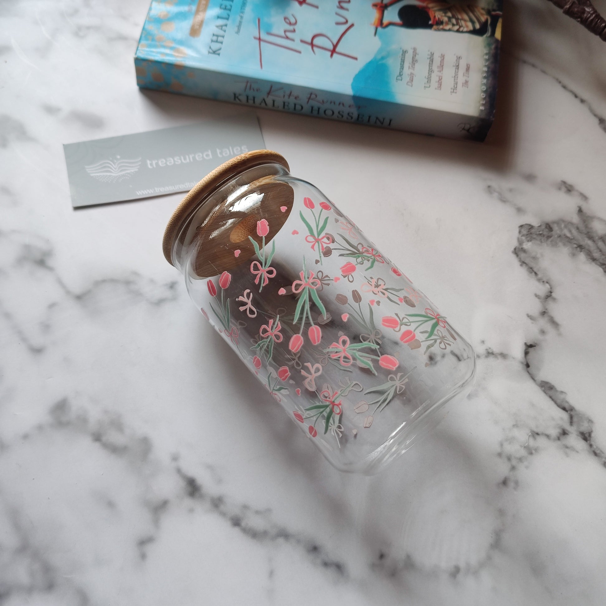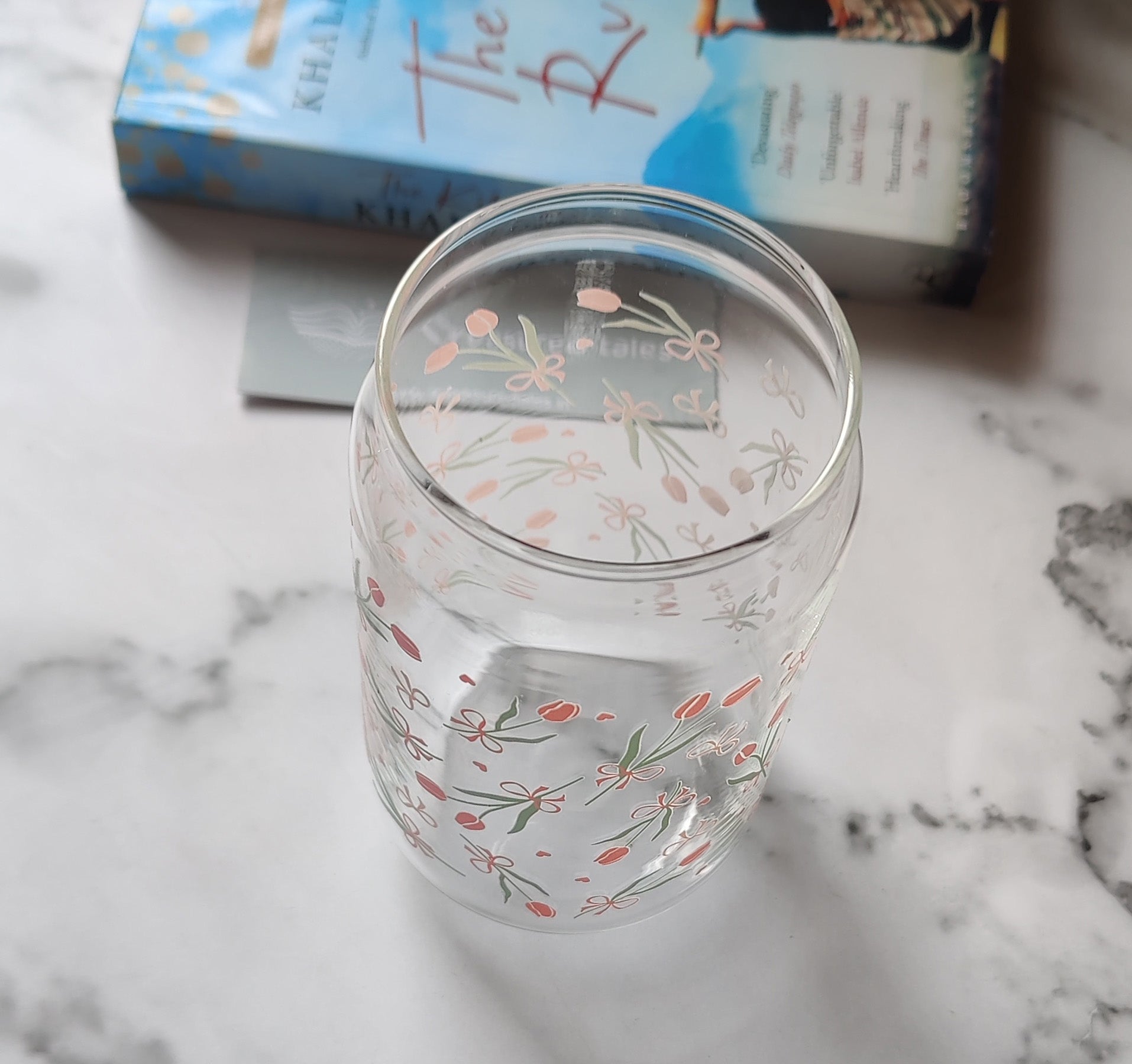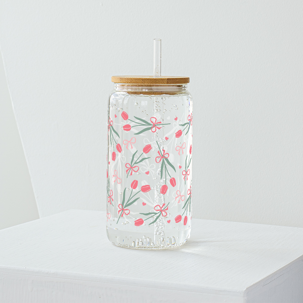 Pink Tulips with Bow Glass Tumbler - Clear 540ml