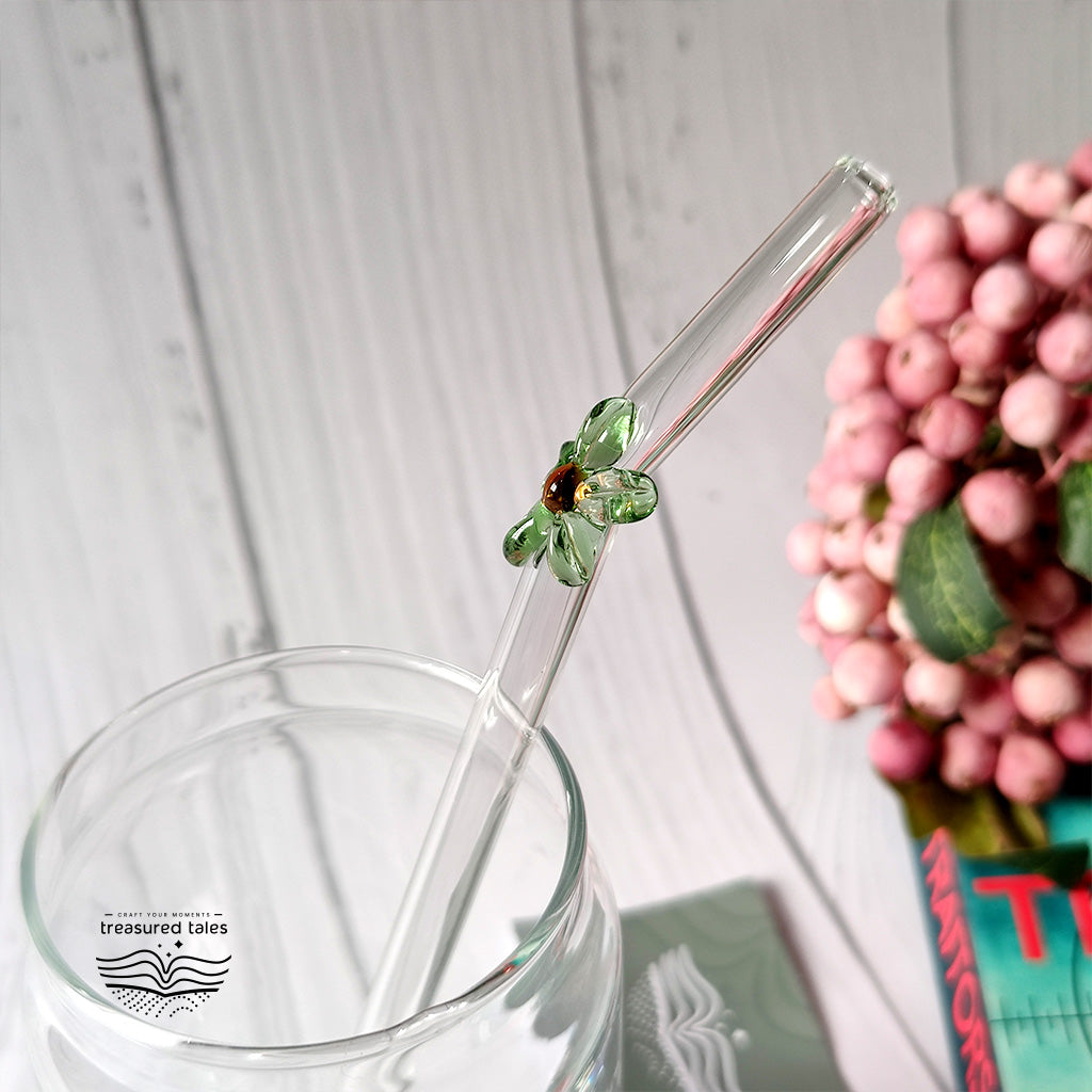 Reusable Clear Glass Straw with Green Flower, Vibrant and Adorable Flower Straw – Ideal for Smoothies, Milkshakes, Juices, Teas, Parties, and Gift-Giving