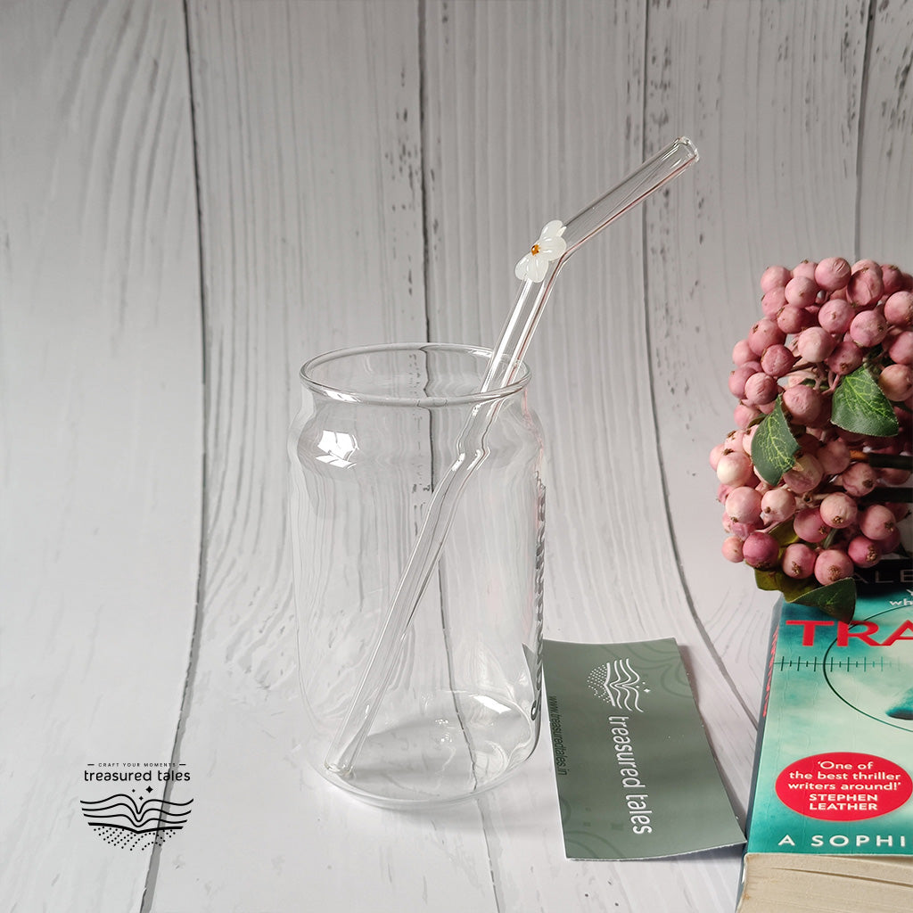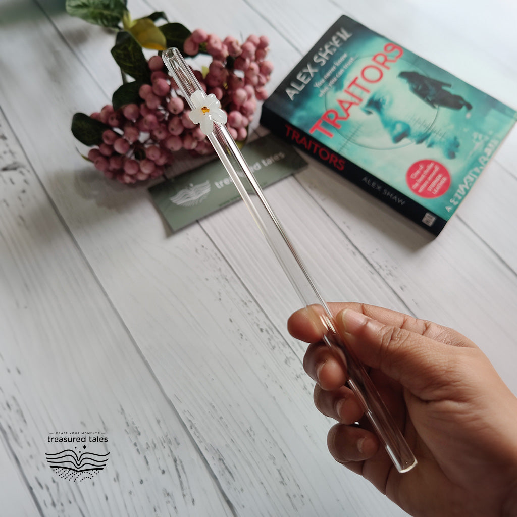 Reusable Clear Glass Straw with White Flower, Vibrant and Adorable Flower Straw – Ideal for Smoothies, Milkshakes, Juices, Teas, Parties, and Gift-Giving