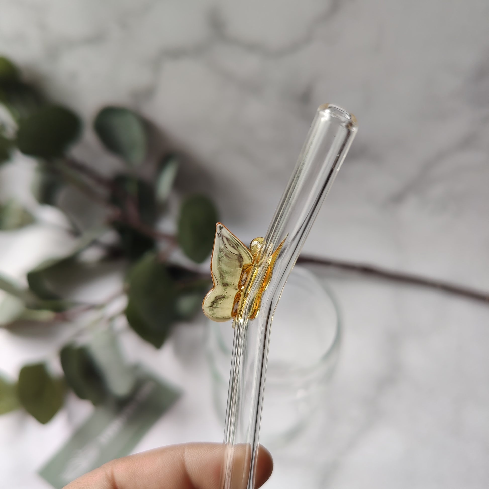 Reusable Clear Glass Straw with Yellow Butterfly, Vibrant and Adorable Butterfly Straw – Ideal for Smoothies, Milkshakes, Juices, Teas, Parties, and Gift-Giving