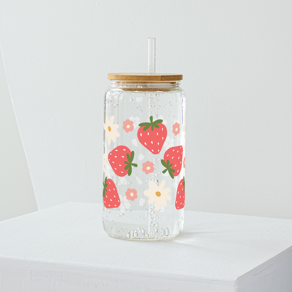 Strawberry with Daisy Flowers Glass Tumbler - Clear 540ml